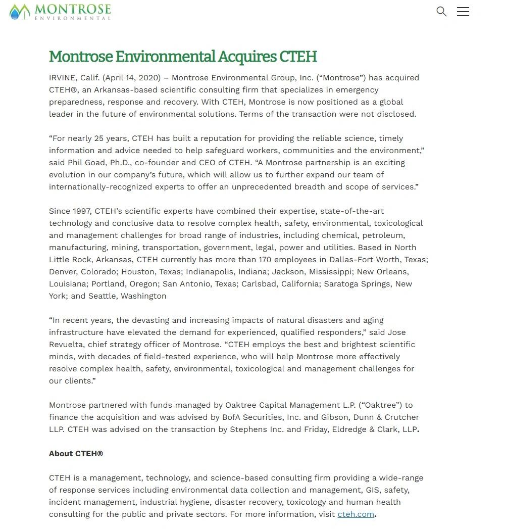 Montrose Environmental Group acquired the Little Rock, Arkansas based company Center for Toxicology and Environmental Health (CTEH) in April of 2020 utilizing funds from Oaktree Capital Management.